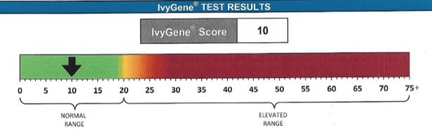 Your blood sample will be sent to the laboratory for analysis. Once the lab receives your kit, results will be returned to your provider within five business days, following which an interpretation of the results will then be sent to you, along with an IvyGene Score based on normal and elevated ranges. The lower the score, the better.